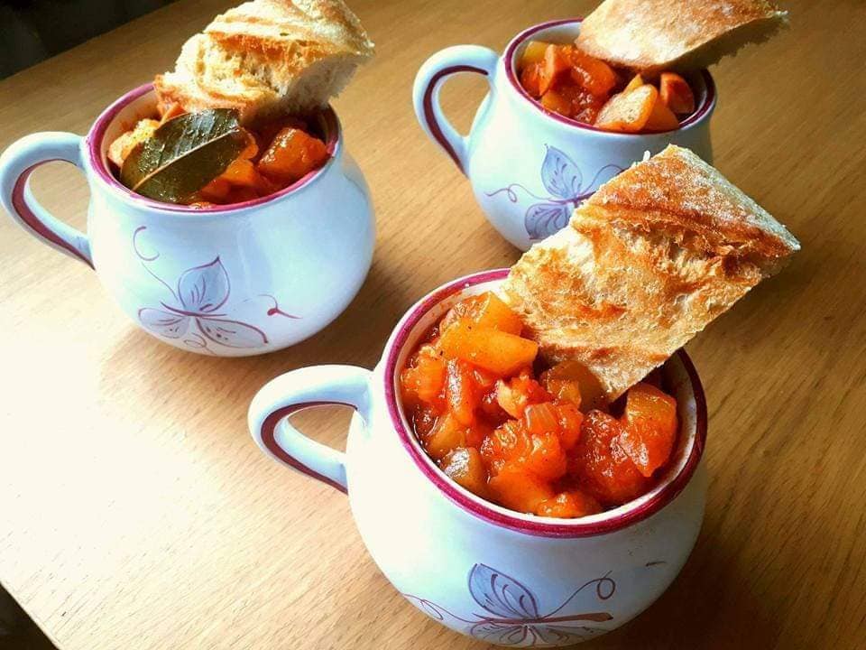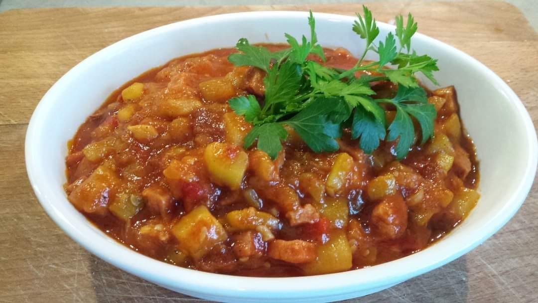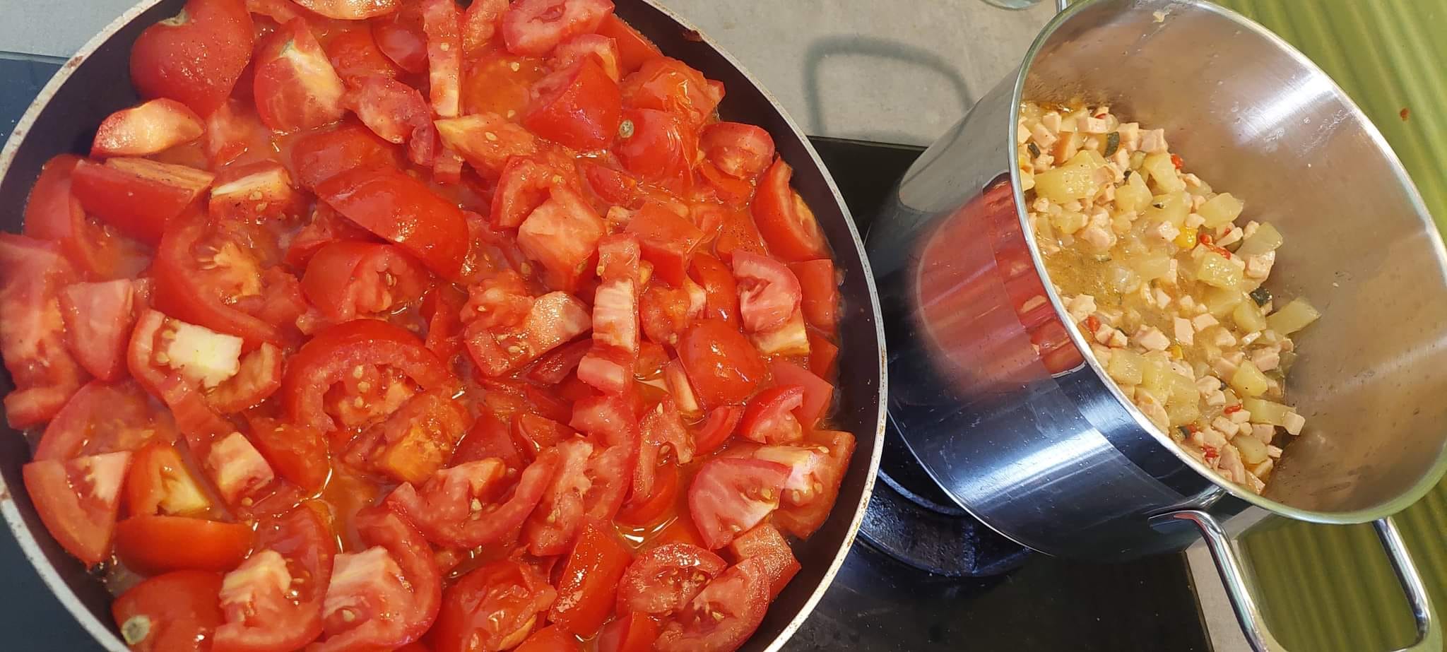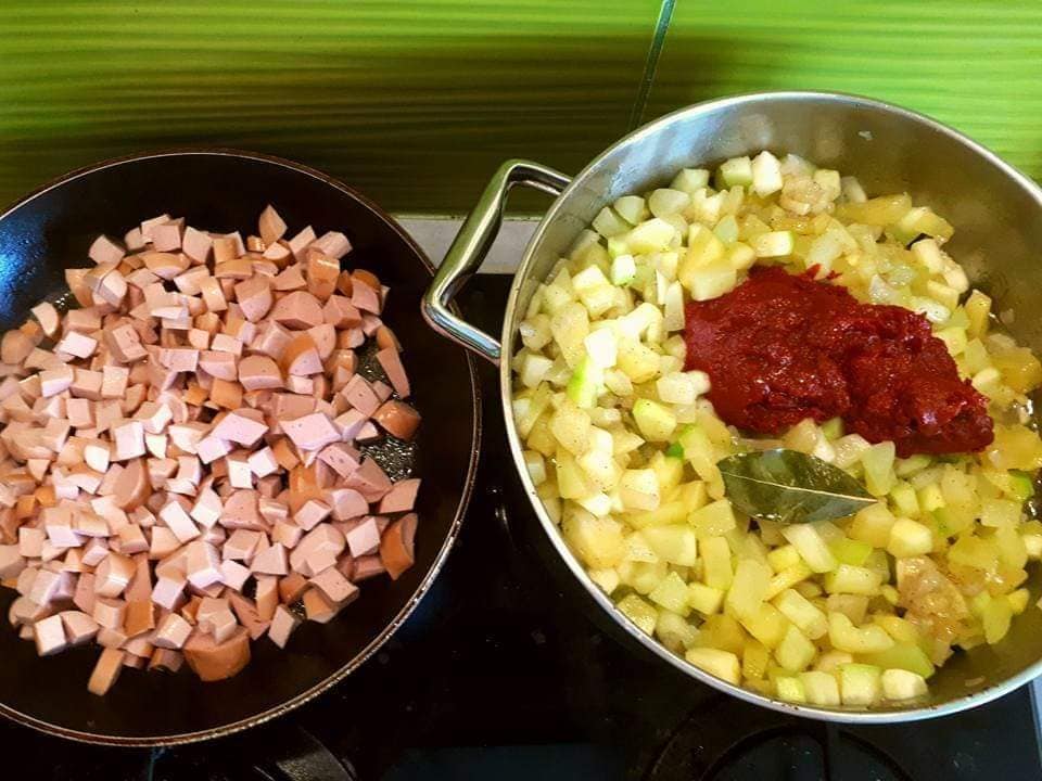 Koncentrat przesmażam i dodaję do reszty. Pomidory kroimy i dusimy do miękkości, po czym przecieramy przez sito dodając do warzyw i wędlin. Wszystko dusimy max. 30 minut – do momentu ulubionej konsystencji. Tak samo jest z ilością wody dodajemy tyle ile lubimy mieć sosu.