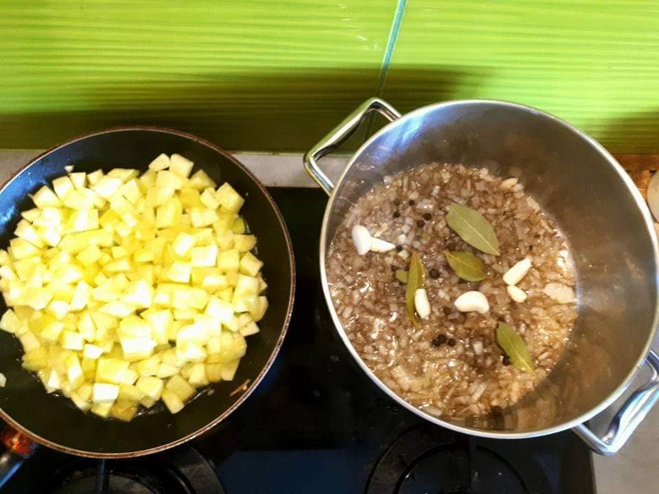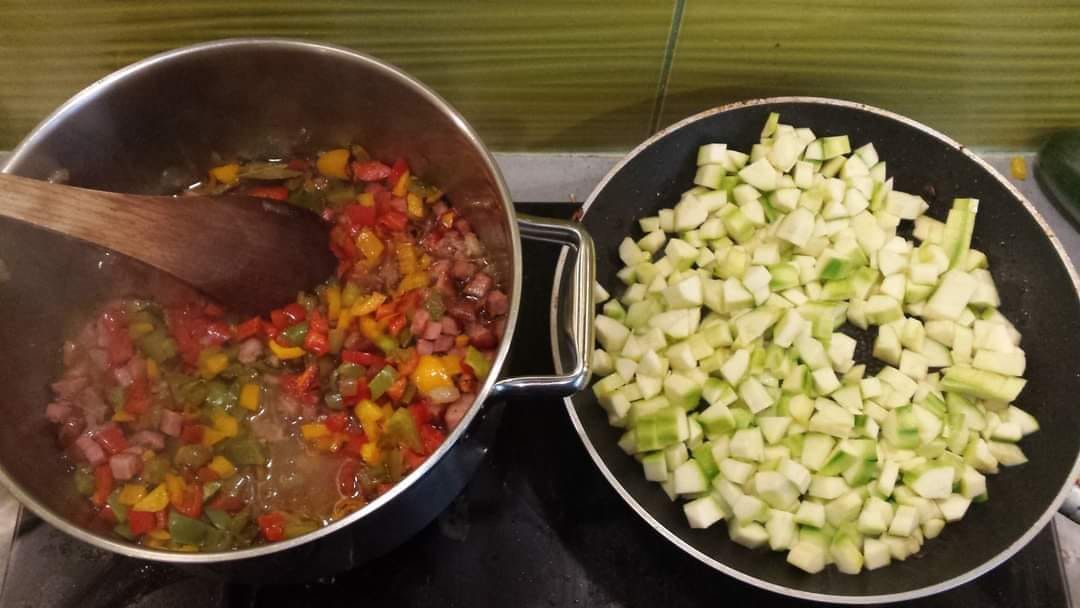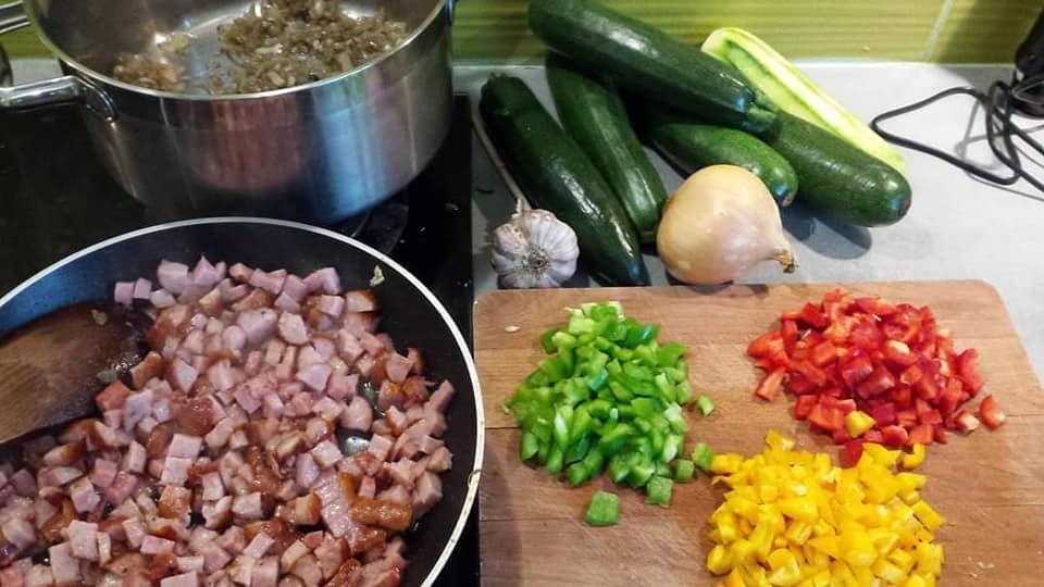 Wszystkie warzywa i szynkę (oczywiście może być inna wędlina, ale również można zupełnie ten składnik pominąć) kroję w kostkę i obsmażam na patelni i do gara. Cebulkę i czosnek w drobną kostkę i dusimy z przyprawami na patelni i też wrzucamy do garnka.