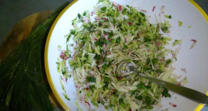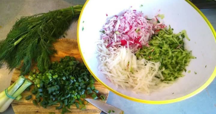 Wszystkie warzywa: ogórek, rzodkiewka, rzepa, rzodkiew, koper, szczypiorek drobno siekamy, przyprawiamy solą i pieprzem.