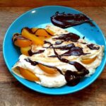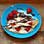 Do naleśników dodajemy ulubione owoce i polewamy czekoladą ( tabliczka gorzkiej czekolady i pół szklanki śmietanki 36% rozpuszczone w kąpieli wodnej)